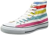 多色のボーダー柄を施したオールスター。スカイブルー・レッド・イエロー・ターコイズ・ピンクの5色ボーダーをデザイン。落ち着きのあるネイビーとは対照的に、元気な配色になっています。