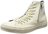 いつもよりも直径の小さなはと目が左右に2列、びっしりと並んだすさまじいオールスター。丸シューレースは当然ながら細めで、はと目の数が多いぶん長いものが使われています。自分で通す必要は無く、はじめから通した状態になっています。脱ぎ履きしやすいサイドファスナーを装着。アッパーからソールまですべてをホワイトに合わせたモノクロームカラーもポイントです。