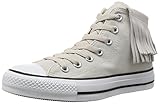 フリンジを履き口の周りに装着したレディース向けオールスター。歩いたときにひらひらと動くよう、フリンジは長めに作られ、しかも二重に取り付けられています。アッパーはキャンバス、フリンジはスエード素材というコンビ使い。シューレースや織りネームもホワイトに合わせた統一感のあるデザインも特徴です。