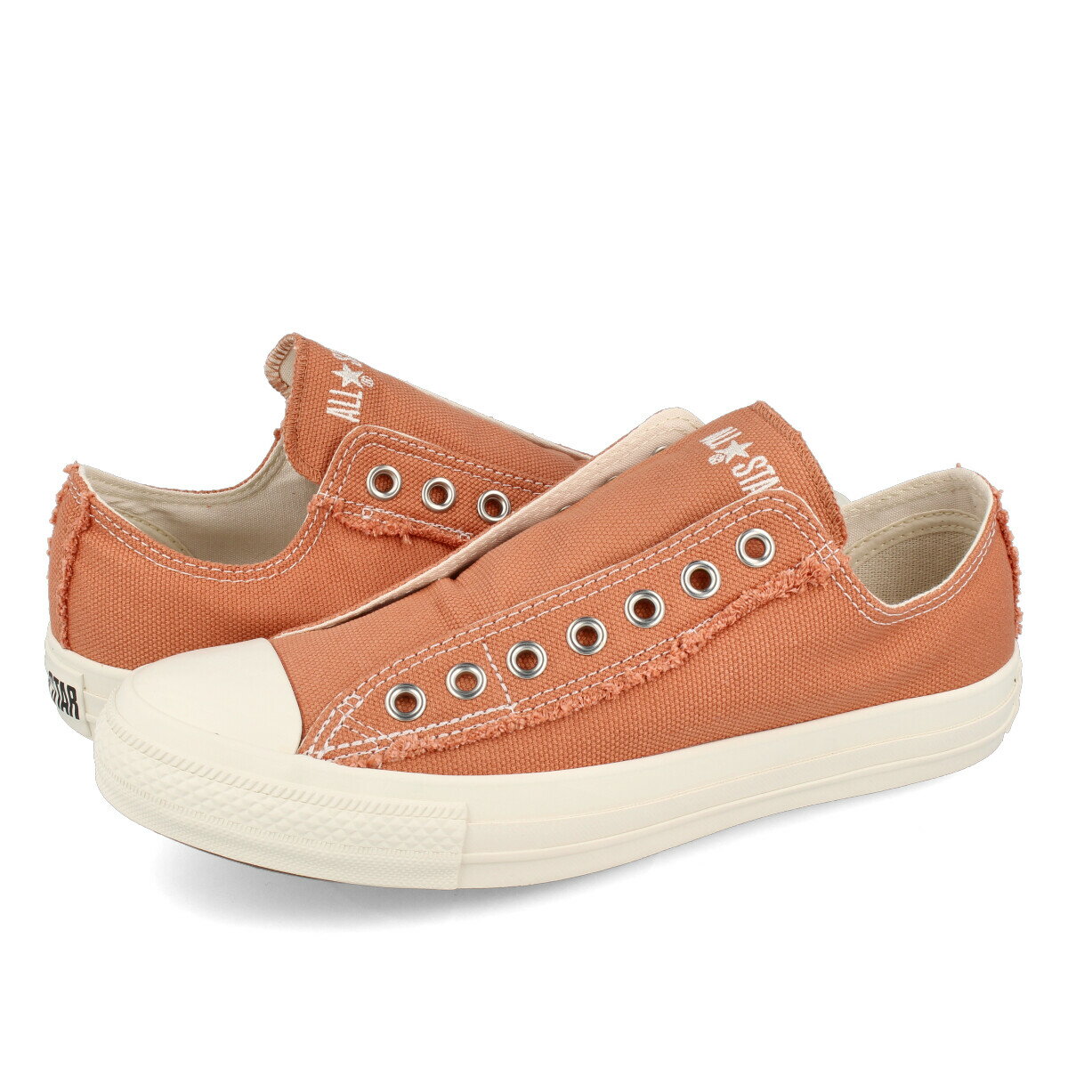 目の粗いキャンバス生地に、はと目飾りやカカト部分にはほつれ加工を施して全体的にラフな印象に仕上げたオールスター。刺繍による織りネームがワンポイントです。紐なしでも通しても履ける2WAYスリップオン仕様。