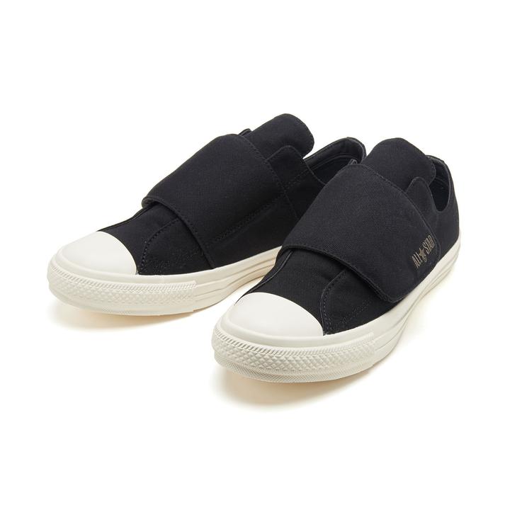 シューレースの代わりに1枚の大きなベルトを装着したオールスター。脱ぎ履きのしやすさとフィット感を兼ね備えています。ベルト先端のALL★STARロゴがワンポイント。