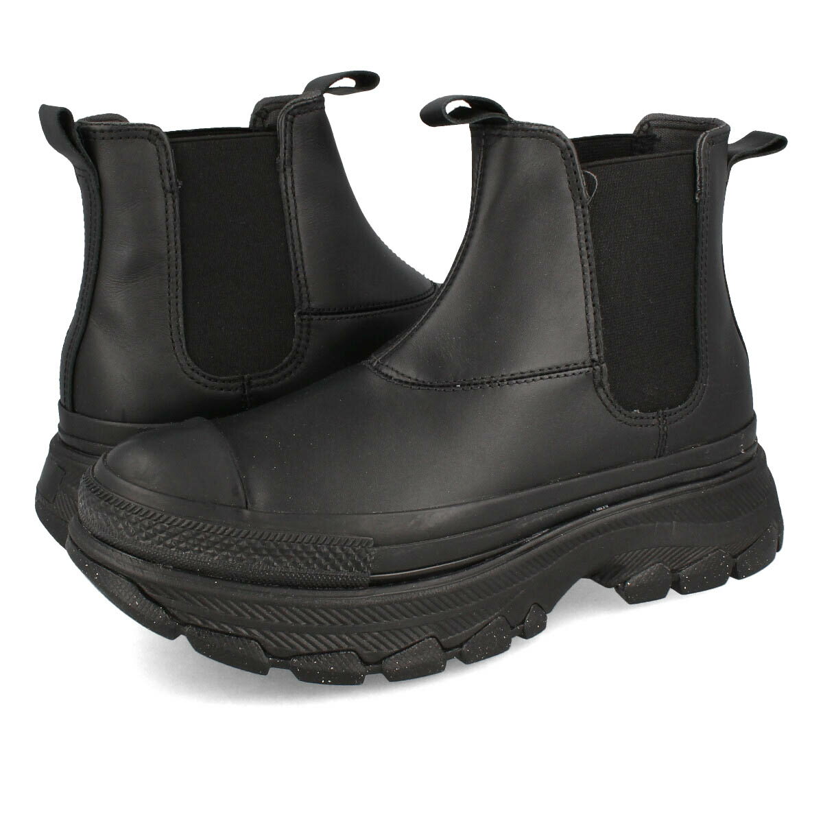 トレッキングシューズのようなボリューム感満天のアウトソールを搭載した「オールスター トレックウエーブ」の素材・パターンアレンジ。履き口の伸縮性が特徴のサイドゴアパターン採用で、脱ぎ履きをしやすくしています。クッション性と滑りにくさを兼ね備えたソールが機能性をさらにプラス。シックで合わせやすいブラックモノクロームを、上質なレザー素材で落とし込んでいます。